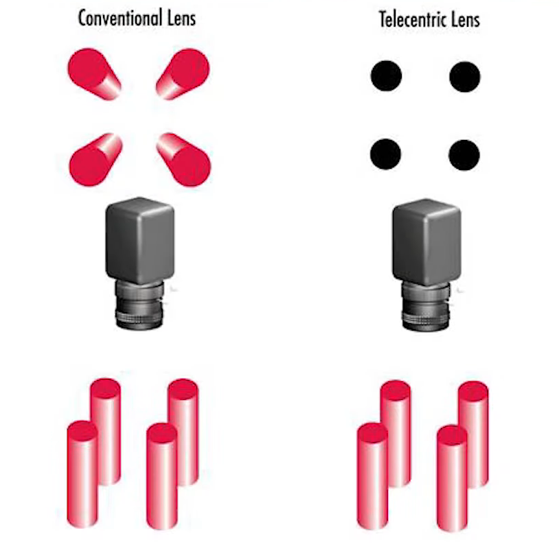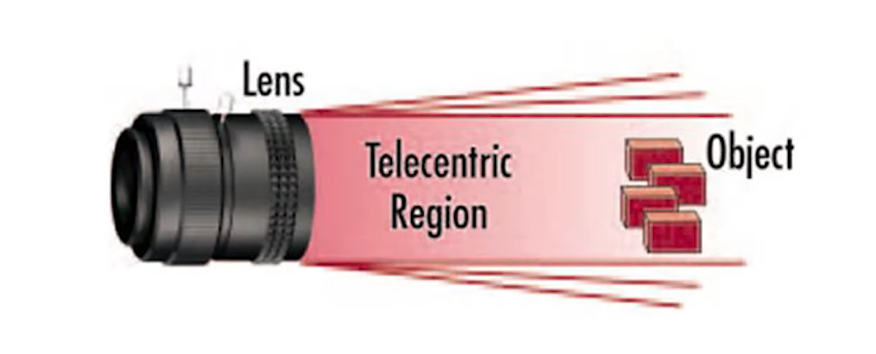 Телецентрический объектив, как и один из этих здесь, на самом деле спроектирован так, чтобы не иметь никакого углового поля, связанного с ним. Большинство стандартных объективов будут иметь какое-то угловое поле, связанное с ними, и поэтому мы можем видеть более крупные объекты на больших расстояниях и более мелкие объекты на более близких расстояниях. Для телецентрических объективов мы фактически поддерживаем увеличение, поскольку расстояние до линзы увеличивается или уменьшается. Это приводит к появлению некоторых действительно полезных свойств, которые мы можем использовать.