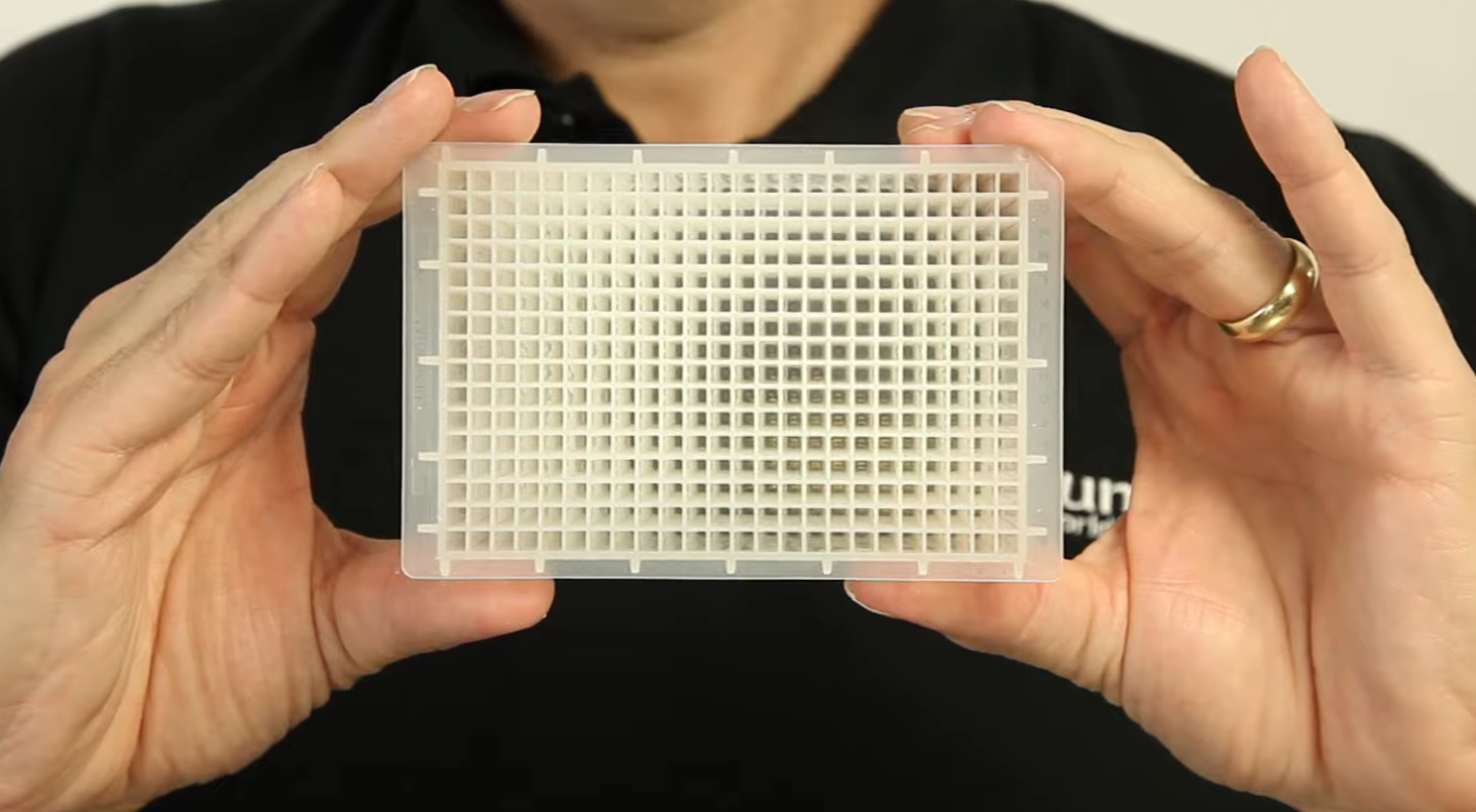 Глядя на эту пластину, вы можете видеть, что она имеет значительную глубину и в ней есть набор различных отверстий. Со стандартным объективом, таким как тот, что у нас здесь, на камере, когда мы смотрим в него, мы можем видеть, что нижняя часть тех отверстий, что посередине, находятся прямо на оптической оси объектива, но, когда мы спускаемся до краев очень трудно увидеть лунки до самого низа, а то и вообще невозможно. Однако с телецентрической линзой мы действительно можем видеть дно каждой из этих лунок по отдельности, все одновременно, и иметь возможность извлекать из нее данные и получать информацию.