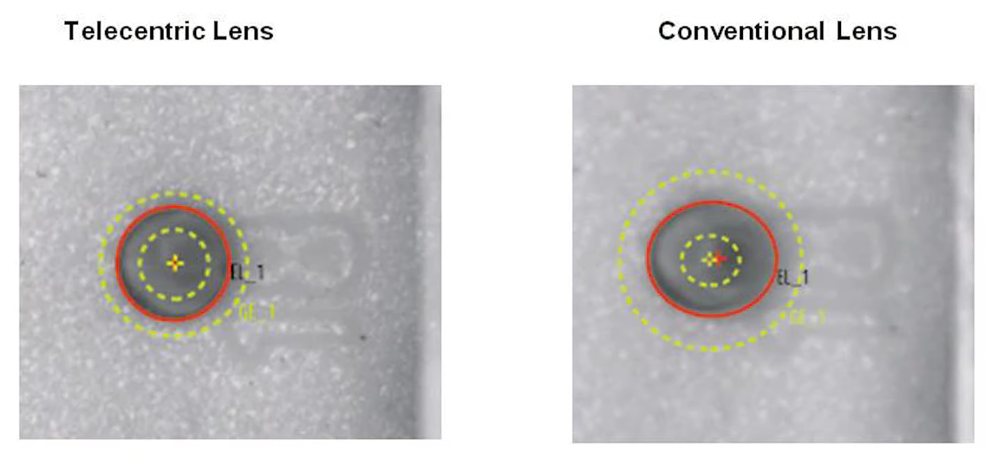 Некоторые другие приложения мы видим сейчас на слайде. Мы могли бы посмотреть на набор перемычек, которые находятся на разных уровнях, и фактически измерить смещение. Мы видим на слайде, что штифт выглядит немного продолговатым, а информация вокруг нее имеет продолговатую форму. Реальный центр и фактический измеренный центр этого объекта из двух разных положений, потому что штифт смотрит в сторону камеры и смещен в сторону, изображение отображается под углом из-за изменения увеличения в системе. Это затрудняет точное определение того, где он находится в пространстве, и расстояние до штифта рядом с ним или до штифта, находящейся на другом уровне. С телецентрическим объективом реальное положение и фактическое положение, воспринимаемое камерой, находятся в одном и том же точном положении от центра к центру, мы можем измерить расстояние даже на предметах, которые находятся не в фокусе.