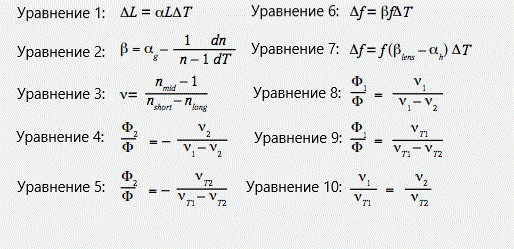 Тепловая дефокусировка – это изменение положения точки фокуса на оси при изменении температуры из-за изменения показателя преломления с температурой (dn/dT) и расширения материала. Аналогичное уравнение, количественно определяющее изменение фокусного расстояния линзы в воздухе в зависимости от температуры, дается уравнением 2, где β – термооптический коэффициент.