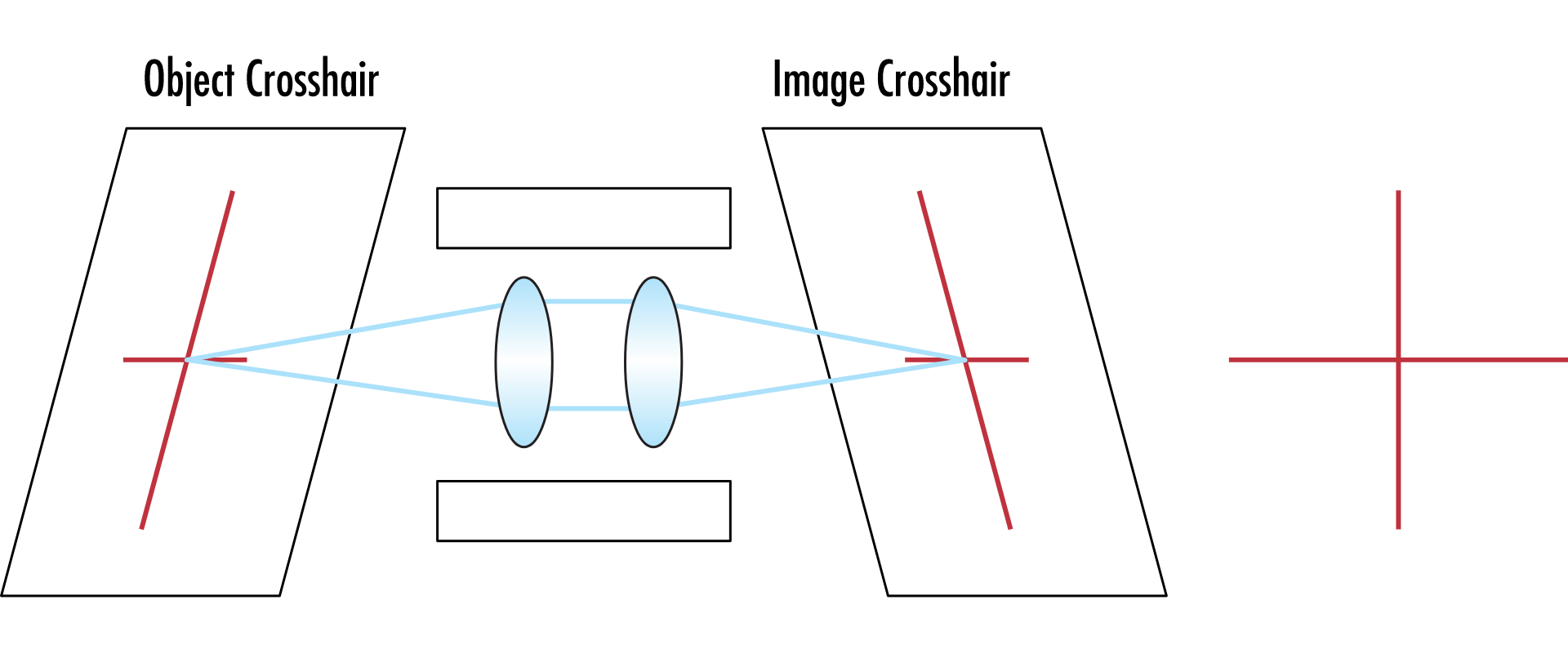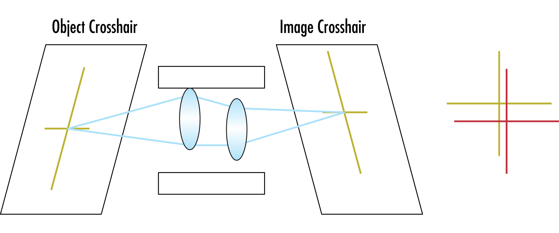 Невозбужденная система, в которой перекрестие объекта сопоставляется с перекрестием изображения (а), и возбужденная система, в которой линзы децентрализованы внутри цилиндра и изменяется оптическая стабильность наведения (b)