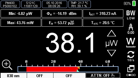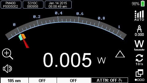 Пример: S120C имеет диапазон измерений оптической мощности от 50 нВт до 50 мВт и разрешение 1 нВт. Это означает, что минимальная измеряемая мощность составляет 50 нВт, а наименьшая значащая цифра на дисплее для этого диапазона измерения будет иметь значение 1 нВт.