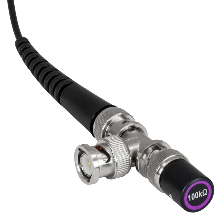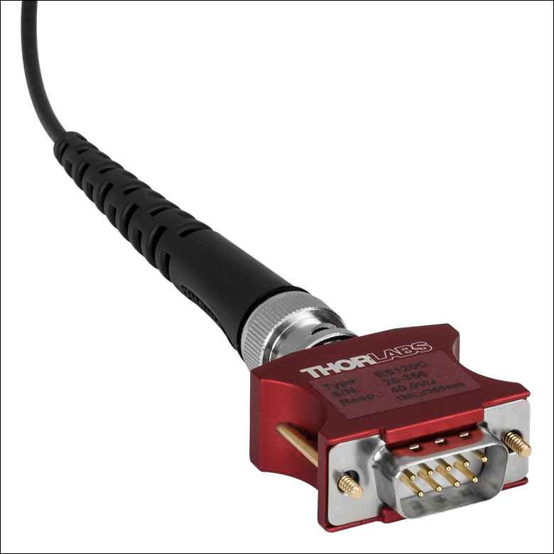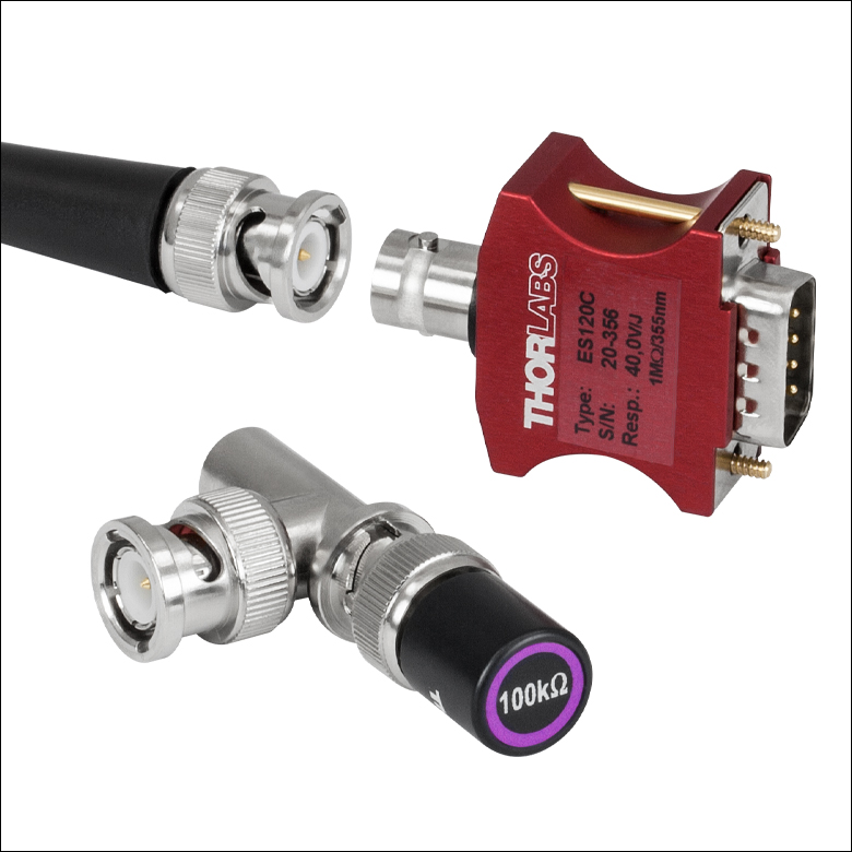 Чтобы выполнить эту настройку с пироэлектрическими датчиками серии C от Thorlabs, сначала отсоедините разъем BNC от красного разъема D-sub, подключите разъем BNC через терминатор к высокоомному входу Y осциллографа. Чувствительность в Дж/В датчика энергии с нагрузкой 100 кОм можно найти в спецификации для каждого отдельного датчика, и ее можно использовать для расчета мощности по измеренному пиковому напряжению.