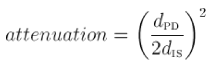 Входящий световой пучок диффузно отражается от внутренней поверхности сферы, что создает равномерное распределение интенсивности по всей поверхности. Фотодиод утоплен внутри порта детектора, чтобы избежать попадания паразитного излучения. Следовательно, ослабление излучения, регистрируемого фотодиодом, пропорционально активной площади детектора, деленной на площадь поверхности сферы. Если dPD – это диаметр активной области детектора, а dIS – это внутренний диаметр интегрирующей сферы, то затухание можно записать как: