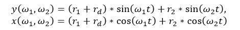 Можно показать, что при вращении двух призм с постоянной скоростью можно проследить большое разнообразие форм. Эти формы продиктованы уравнением:
