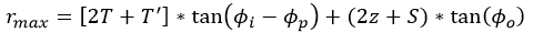 В этом параметрическом уравнении rmax – радиус этого круга (любая последующая форма, созданная этой установкой, заключена в этот радиус), T – средняя толщина первой призмы, T '– эффективная толщина призмы 2 после отклоненного пучка, проходящего через нее, Φi – это угол, образованный при падении пучка на первую поверхность первой призмы согласно закону Снеллиуса, Φp – результирующий угол, который принимает пучок внутри призмы относительно нормали к первой поверхности согласно закону Снеллиуса, z – расстояние от второй поверхности второй призмы до поверхности сканирования, S – расстояние между призмами, а Φo – угол пучка относительно исходной оптической оси после выхода из второй поверхности первой призмы.