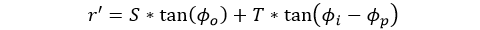 В этом уравнении r' – радиус круга, S – расстояние от последней поверхности призмы до поверхности сканирования, T – толщина от центра призмы, Φo – угол пучка относительно исходной оптической оси после выхода из второй поверхности призмы, Φi – это угол, образованный при падении пучка на первую поверхность призмы согласно закону Снеллиуса, а Φp – результирующий угол, который пучок принимает внутри призмы относительно нормали к первой поверхности согласно закону Снеллиуса.