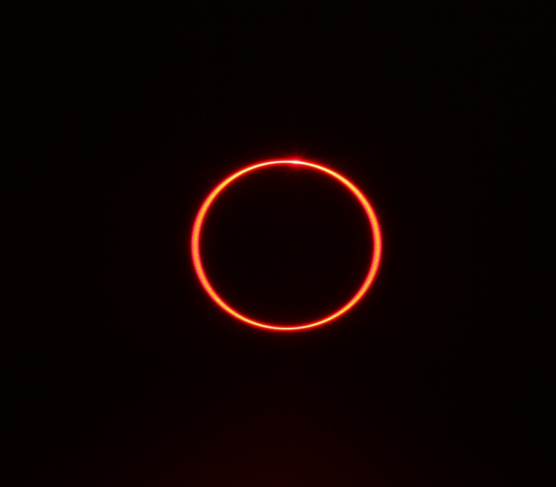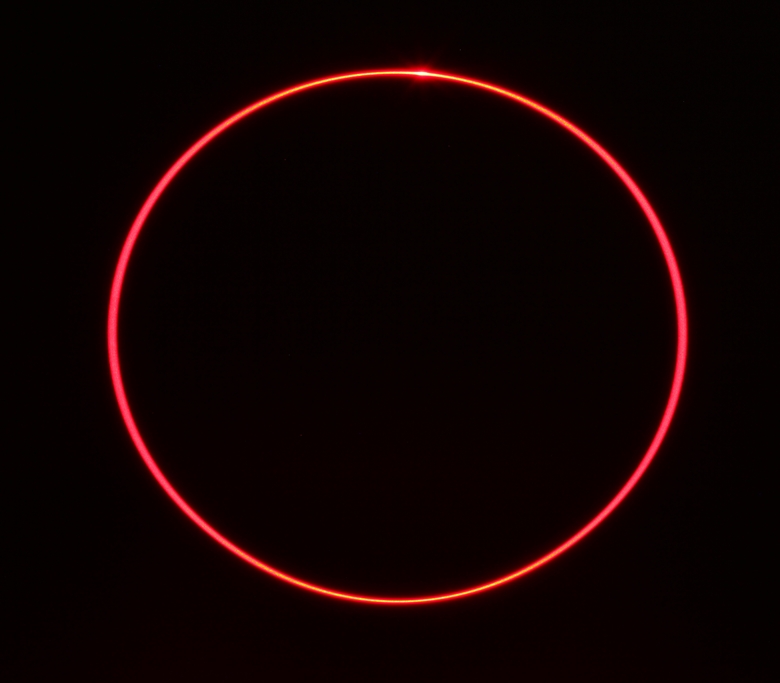 Для этого случая в вращающемся креплении была установлена только одна призма. Входящий пучок отклонялся от оси клиновидной призмой. Как только вращающееся крепление было запущено, призма стала вращаться вокруг оптической оси, в результате чего отклоненный пучок образовывал небольшой круг, как показано на фотографии с длинной выдержкой справа. Радиус этого круга можно рассчитать, как: