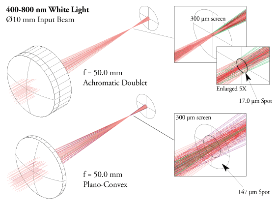Использование ахроматов выгодно для любого приложения широкополосной визуализации, которое использует большой диапазон длин волн. На рисунке ниже показано влияние на фокусное расстояние ряда волн различной длины, падающих как на плосковыпуклый синглет, так и на ахроматический дублет. Диаметр фокального пятна уменьшен со 147 мкм до 17 мкм за счет замены синглета ахроматическим дублетом.