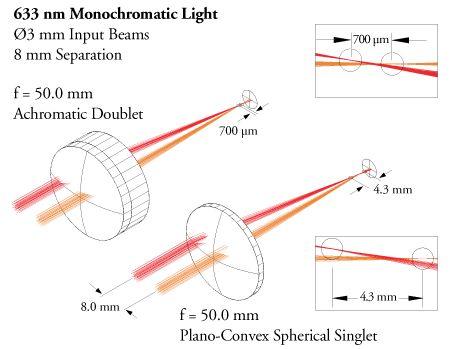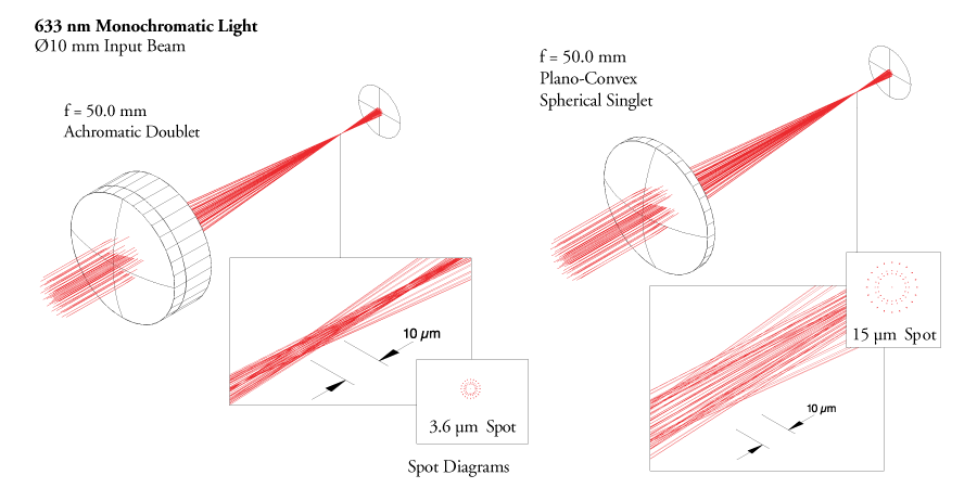 Когда оптическая система используется с монохроматическим излучением, хроматическая аберрация, описанная выше, не имеет значения. Однако сферические синглеты все еще могут вносить значительные монохроматические аберрации, такие как сферические аберрации и кому. Многоэлементная конструкция ахроматических объективов снижает эти аберрации и приводит к значительному повышению качества изображения и более жесткой фокусировке монохроматического излучения. Например, на рисунке ниже сравниваются характеристики плосковыпуклой линзы и ахроматического дублета при фокусировке монохроматического пучка лучей. Как видно, диаметр фокального пятна, создаваемого дублетом, в 4.2 раза меньше диаметра пятна, создаваемого синглетом.