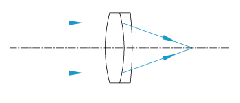 На рисунке ниже показаны две линзы Ø25 мм, f = 50.0 мм, одна из которых представляет собой плосковыпуклую сферическую линзу, а другая – ахроматический дублет. Каждая линза имеет один пучок, распространяющийся вдоль оптической оси, а другой – параллельно оси, но смещенный на 8 мм. Ахроматический дублет уменьшает как боковые, так и поперечные аберрации; боковое смещение фокальных точек (обведенных на диаграмме) уменьшается в шесть раз, а диаметр фокального пятна также значительно меньше.