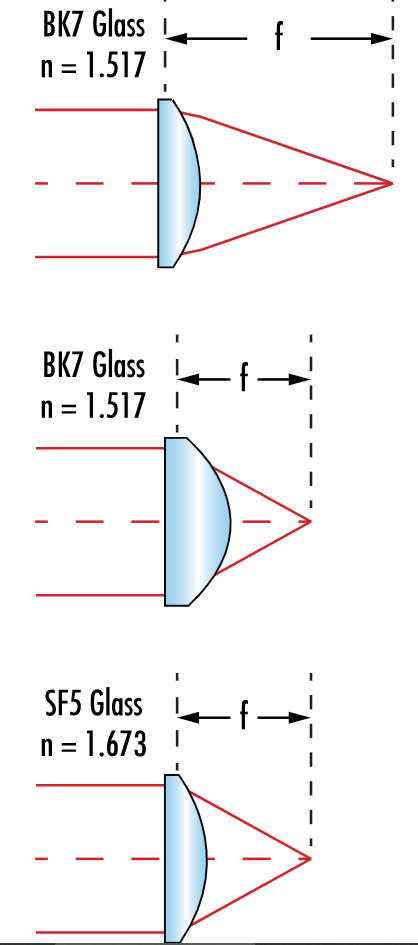 Фокусное расстояние зависит от показателя преломления стекла и формы поверхностей линз