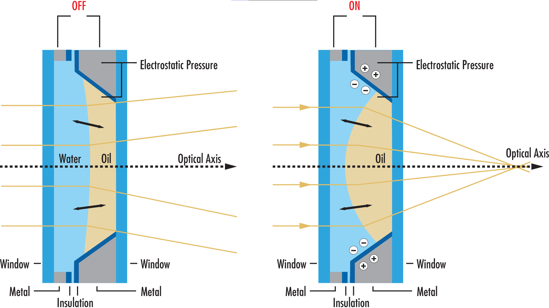 Жидкостные линзы с переменным фокусным расстоянием фокусируются с помощью процесса, называемого электросмачиванием, который представляет собой приложение электрических полей для управления смачивающими свойствами, а, следовательно, формой и кривизной жидкости. Ячейка жидкостной линзы содержит две несмешивающиеся жидкости: непроводящее масло и водный раствор, разделенные границей раздела. Приложение напряжения на границе раздела между двумя жидкостями изменяет кривизну и, следовательно, фокусное расстояние линзы в течение десятков миллисекунд. Приложение большего напряжения увеличивает общую кривизну и оптическую силу жидкостной линзы. Емкостные характеристики жидкостных линз с регулируемым фокусным расстоянием обеспечивают стабильную работу в высокотемпературных средах после достижения теплового равновесия. Кроме того, две жидкости внутри линзы имеют одинаковую плотность, что делает систему нечувствительной к вибрации и ударам. С жидкостными линзами с переменным фокусным расстоянием может быть сложно работать, поскольку их небольшой размер затрудняет их использование с существующими объективами. Они лучше подходят для полной интеграции в оптические конструкции, где их размер не является ограничивающим фактором.
