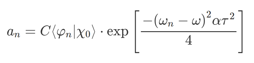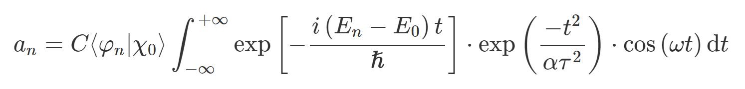 Рассматривая гауссовский сверхкороткий лазерный импульс, переводящий систему из одного состояния χ0 с энергией E'0 в другие состояния ϕn с соответствующими энергиями En, волновая функция определяется выражением: