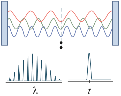 Базовая концепция генерации сверхкоротких импульсов посредством синхронизации мод, в результате чего получаются импульсы с широкой полосой пропускания длин волн, но сверхкороткой длительностью
