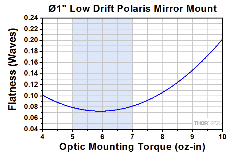 Оптическое искажение зеркала BB1-E02, установленного в держатель Polaris диаметром 1". При нулевом крутящем моменте плоскостность образца зеркала составляла λ/10 на чистой апертуре (λ = 633 нм). Заштрихованная область указывает рекомендуемую величину крутящего момента.