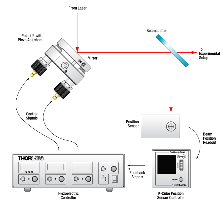 Пример системы стабилизации пучка показан на схеме. Светоделитель, поставленный на оптическом пути пучка, посылает часть пучка на датчик положения, который отслеживает его смещение относительно центра детектора. (Для оптимальной стабилизации светоделитель должен располагаться как можно ближе к месту измерения.) Детектор положения выдает сигнал ошибки по осям X и Y, который пропорционален положению пучка. Каждый сигнал ошибки подается в канал пьезоэлектрического контроллера, который направляет пучок обратно в центр датчика.