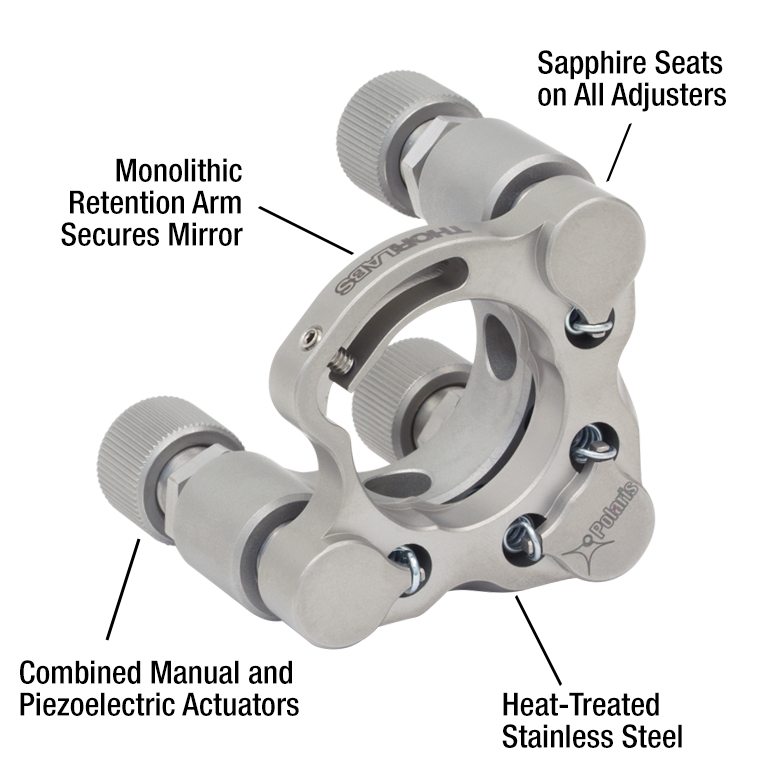 Кинематические держатели зеркал Polaris® с пьезоэлектрическими регуляторами – идеальное решение для приложений, требующих строгой, активно контролируемой и долговременной точности выравнивания пучка.
