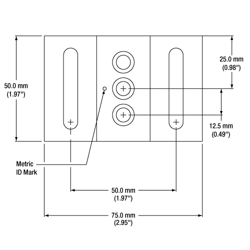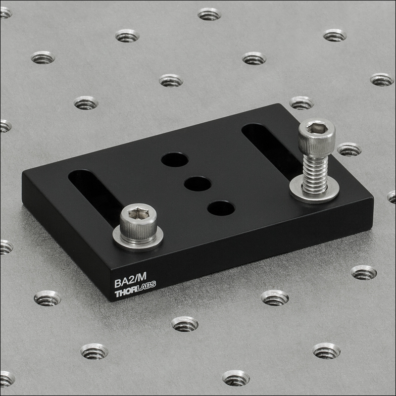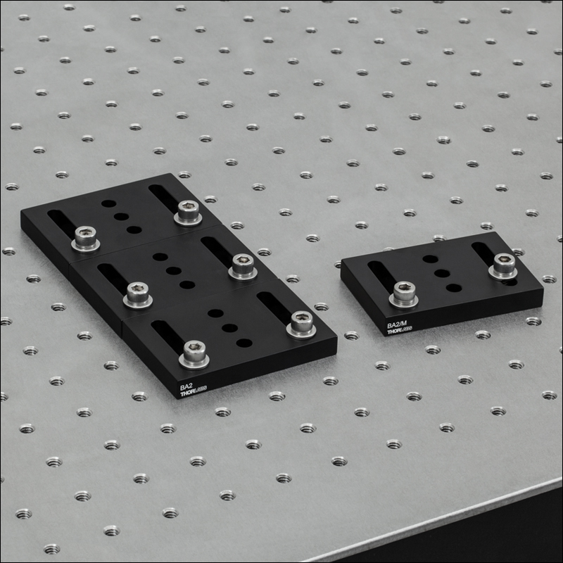 Кроме того, внешние размеры BA2 составляют 2" x 3" x 3/8" (50.8 мм x 76.2 мм x 9.5 мм), а внешние размеры BA2/M составляют 50 мм x 75 мм x 10 мм (1.97" х 2.95" х 0.39"). Эти небольшие различия означают, что несколько оснований BA2 (или BA2/M) могут быть совмещены на дюймовых (или метрических) оптических столах, не оставляя неиспользуемых рядов отверстий.