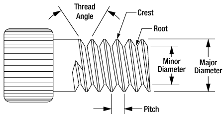 Резьба в первую очередь определяется (наружным) диаметром винта и расстоянием между последовательными витками (шаг). В дюймовом варианте винт с головкой под ключ 1/4"-20 имеет диаметр винта 1/4" и шаг резьбы 20 витков на дюйм. В метрическом варианте винт с головкой под ключ M4 x 0.7 имеет диаметр винта 4 мм и шаг резьбы 1 на 0.7 мм. (Термин M4 x 0.7 часто сокращается до M4.)