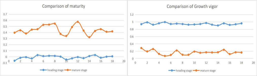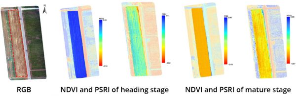 Нормализованный относительный индекс вегетации (NDVI)* и индекс отражения зрелости растений (PSRI)** пшеницы наблюдали путем сбора спектральных данных пшеницы в разные периоды. На более позднем этапе можно определить норму нанесения удобрений и время сбора урожая, объединив взаимосвязь между индексом отражения, содержанием азота и зрелостью зерна.