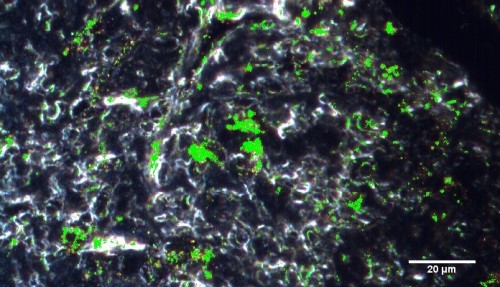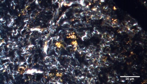 Для подтверждения поглощения Au-наностержней в целевых тканях образцы тканей, подвергшиеся воздействию Au-наностержней, могут быть визуализированы с помощью той же установки микроскопа. На рис. 5 показан неокрашенный образец ткани с интернализованными наностержнями.