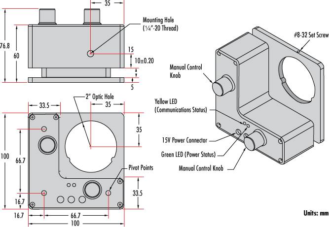 Управляемое компьютером моторизованное кинематическое крепление для зеркала обеспечивает кинематическое движение с высоким разрешением с угловым перемещением 10,5° и 0,264° за оборот двигателя. Как только крепление для моторизованного кинематического зеркала перемещается в нужное положение, оно сообщает о положении через соединение RS-232 и будет поддерживать это положение даже без подачи питания. Потенциометры, расположенные на задней части крепления, обеспечивают удобный способ ручного управления положением. Потенциометры могут использоваться для перемещения монтировки с минимальной скоростью 1,5 мкрад/с до максимальной скорости 60 мрад/с. Во время ручного перемещения монтировка постоянно передает свое положение и может контролироваться с помощью компьютера, хотя для ручного управления компьютер не требуется.