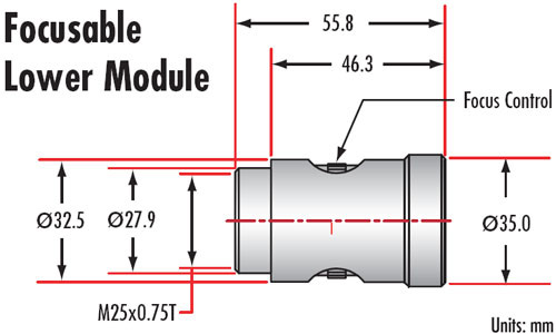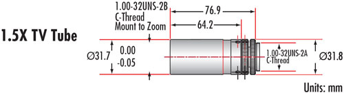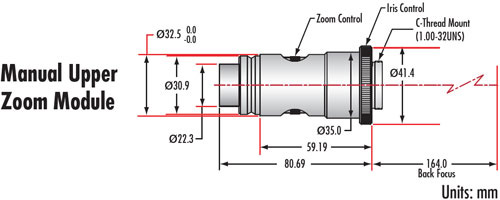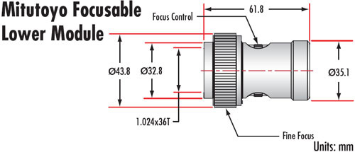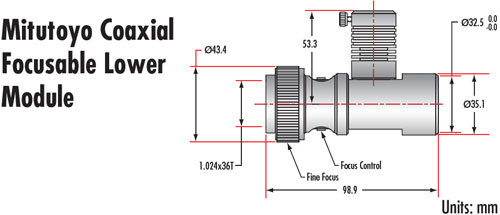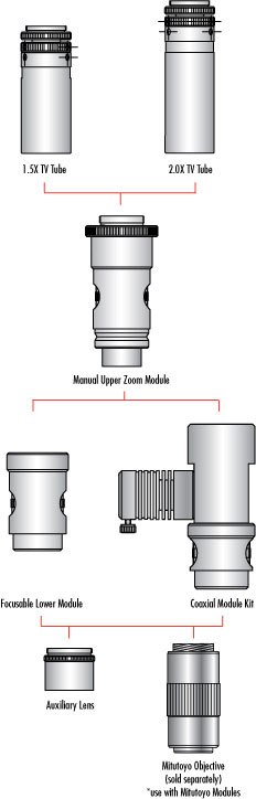 Для полной оптической системы требуются следующие компоненты: телевизионная трубка, верхний зум-модуль и нижний модуль. Телевизионные трубки имеют стандартную резьбу C-Mount и могут фокусироваться для обеспечения парфокальности. Верхние зум-модули оснащены ручной диафрагмой. Фокусирующие нижние модули обеспечивают внутреннюю фокусировку на 10 мм. Фокусирующие нижние модули Mitutoyo обеспечивают внутреннюю фокусировку на 5 мм и имеют как грубую, так и точную настройку. Возможность фокусировки нижних модулей допускает небольшие изменения рабочего расстояния и увеличения. Коаксиальные нижние модули допускают диаметр наконечника 0.187 дюйма и оптимизированы для пучков 1/8 дюйма.