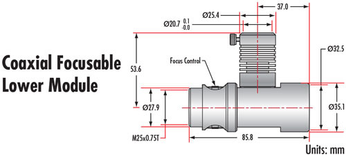 Для полной оптической системы требуются следующие компоненты: телевизионная трубка, верхний зум-модуль и нижний модуль. Телевизионные трубки имеют стандартную резьбу C-Mount и могут фокусироваться для обеспечения парфокальности. Верхние зум-модули оснащены ручной диафрагмой. Фокусирующие нижние модули обеспечивают внутреннюю фокусировку на 10 мм. Фокусирующие нижние модули Mitutoyo обеспечивают внутреннюю фокусировку на 5 мм и имеют как грубую, так и точную настройку. Возможность фокусировки нижних модулей допускает небольшие изменения рабочего расстояния и увеличения. Коаксиальные нижние модули допускают диаметр наконечника 0.187 дюйма и оптимизированы для пучков 1/8 дюйма.