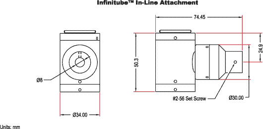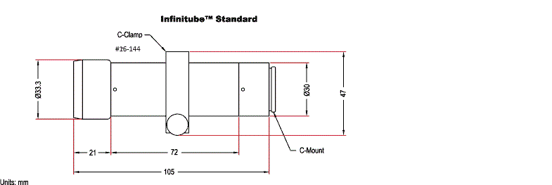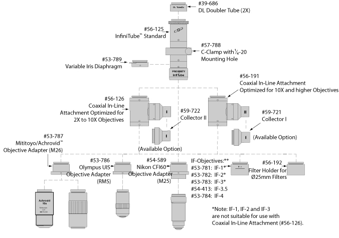 Первая встроенная насадка (#56-126) была разработана для высокой производительности с объективами, имеющими увеличение 10X или меньше, и не рекомендуется для использования с объективами с более высоким увеличением. Второе встроенное устройство (№ 56-191) было разработано для повышения эффективности при использовании с увеличением 10X или выше, но его можно использовать со всеми увеличениями. Также предлагается линейная сборка InfiniTube™ (#54-590), состоящая из InfiniTube™ Standard и линейной насадки с более высоким увеличением. Эту сборку можно использовать со всеми увеличениями. К системам можно добавить держатель фильтра, который крепится к самой InfiniTube™, чтобы использовать фильтры диаметром 25 мм. Эти линзы обычно используются в микроскопии и проверке пластин.