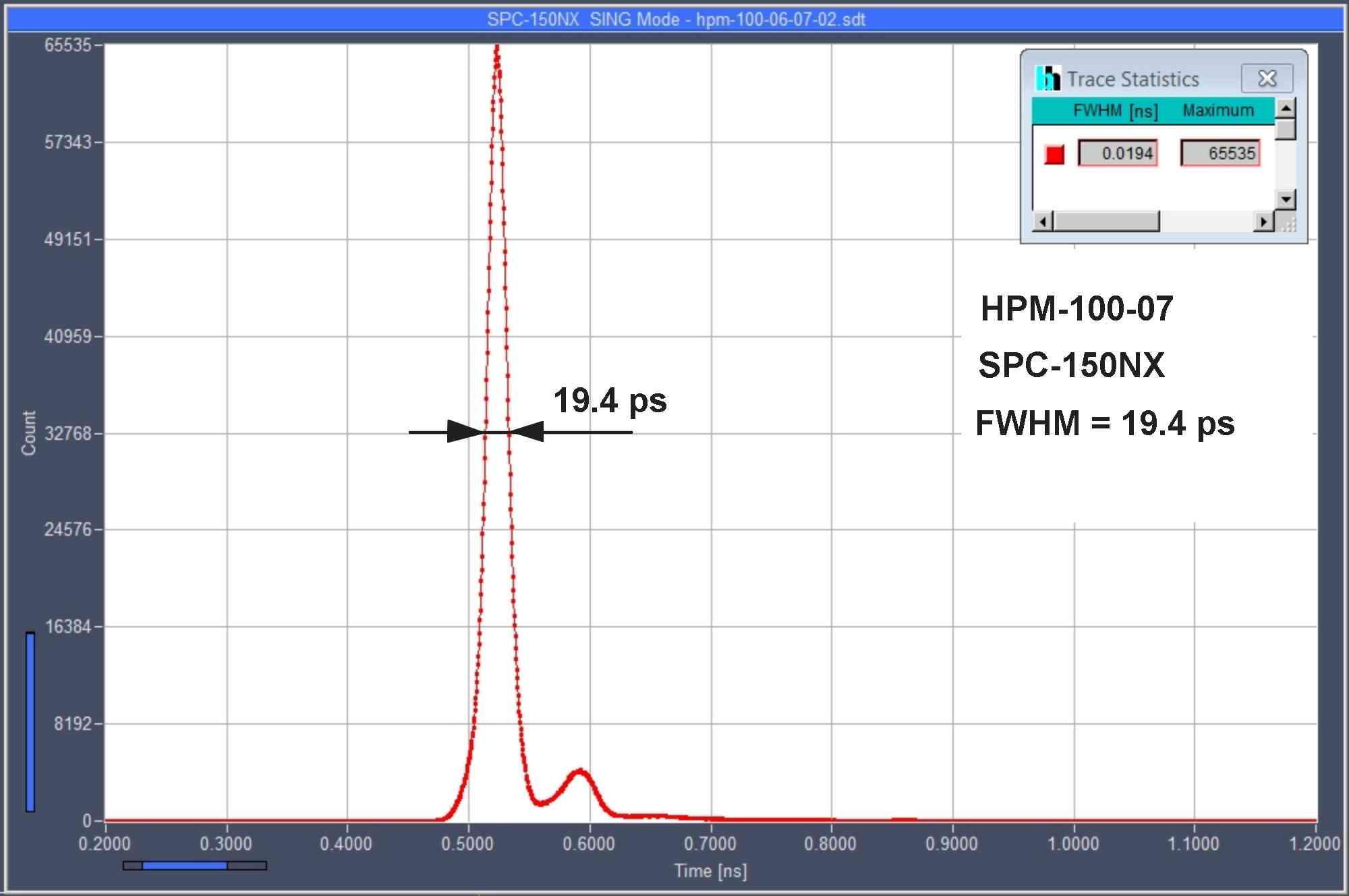 Для тестовых измерений использовался лазер Toptica FemtoFErb с шириной импульса 100 фс. Постановка эксперимента: лазерный пучок проходит через систему нейтральных светофильтров и падает на фотокатоды детекторов HPM-100-06 и HPM-100-07 от компании Becker&Hickl (на основе гибридных фотоумножителей R10467-06 и -07 от Hamamatsu) и ФЭУ c МКП R3809U-50 от Hamamatsu. Полуширина зарегистрированных аппаратных функций указанных детекторов составляет примерно 20 пс, что намного меньше, чем полуширина функции отклика, измеренная для них ранее. Улучшение характеристик связано с широкой шириной полосы пропускания дискриминатора и низким джиттером синхронизирующей электроники модулей SPC-150NX.