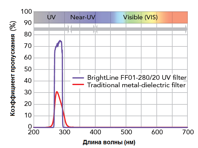 На рис. представлена спектральная характеристика фильтра возбуждения серии BrightLine с максимально достижимым для коммерческих изделий коэффициентом пропускания (> 65%), крутыми краями полосы пропускания и широким блокируемым диапазоном (почти весь УФ и видимый диапазон). Данная характеристика сравнивается с распределением для стандартного фильтра на основе структуры метал-диэлектрик. Эксперимент показал, что фильтры BrightLine улучшают соотношение сигнал/шум в более чем 100 раз.
