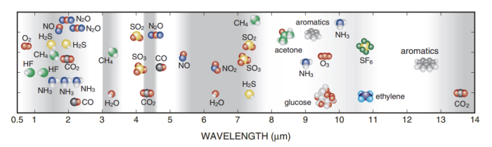 Каждая молекула имеет свою собственную вибрацию и поглощает инфракрасный свет с определенной длиной волны, определяемой ее энергией. Это свойство может быть использовано для анализа и идентификации типа и количества химических компонентов, содержащихся в образце. Поэтому среднее инфракрасное излучение широко используется для анализа оксидов азота и серы, содержащихся в выхлопных газах заводов и т.д.