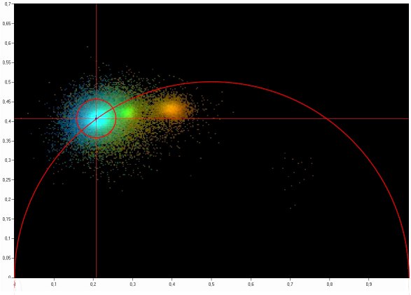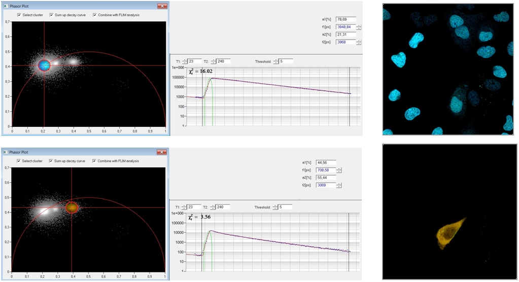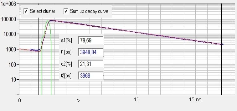 При выборе нескольких кластеров на векторной диаграмме, соответствующие им пиксели отмечаются на FLIM изображениях. Функции времени затухания флоуресценции в каждом пикселе в пределах выбранной области на векторной диаграмме могут быть объединены в одну кривую затухания, объединяющая информацию о большом количестве фотонов. Данная кривая может быть проанализирована с точностью, соответствующей анализу затухания флуоресценции в каждой точке кюветы. Таким образом, из данных можно извлекать информацию о точках с малым значением амплитуды или практически одинаковым временем затухания. Пример работы с разными кластерами, изображенными на диаграмме выше, продемонстрированы далее: