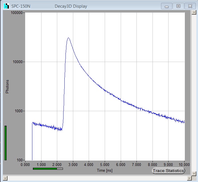 Рис. 1: Образец ландыша, 128 x 128 пикселей, 1024 временных канала, сбор данных: 100 мс. FLIM изображение, кривая затухания в области: 5x5 пикселей, и кривая затухания для всего изображения.