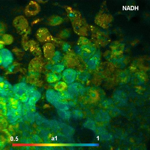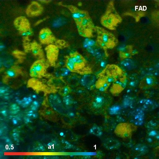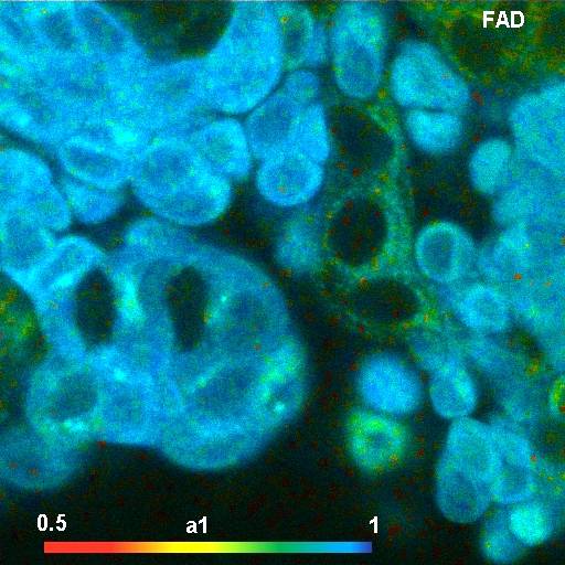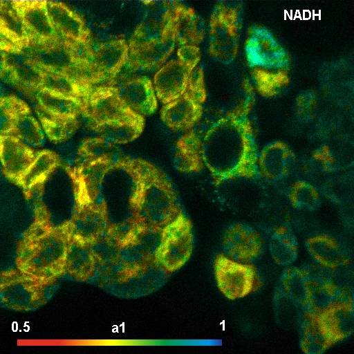 Конфокальная сканирующая FLIM система DCS-120 компании Becker&Hickl позволяет детектировать изменения в метаболическом состоянии живых клеток. В проведенных экспериментах информация о метаболическом состоянии была получена из функций затухания флуоресценции NAD(P)H и FAD. Два пикосекундных диодных лазера с длинами волн 375 нм и 405 нм мультиплексировались для попеременного возбуждения NAD(P)H и FAD. Один FLIM канал DCS системы проводил регистрацию в полосе излучения NAD(P)H, а другой - в полосе излучения FAD. Данные FLIM обрабатывались программным обеспечением для анализа данных SPCImage компании Becker&Hickl. Для обоих каналов при анализе данных получаются изображения амплитудно-взвешенного времени жизни, tm, времени жизни компонентов, t1 и t2, амплитуды компонентов, a1 и a2 и отношения амплитуд a1 / a2. Кроме того, пользователь получает информацию о FLIRR, a2nadh / a1fad. Переход от окислительного фосфорилирования к гликолизу или обратно определяется изменениями tm, a1 или a1/a2 и FLIRR.