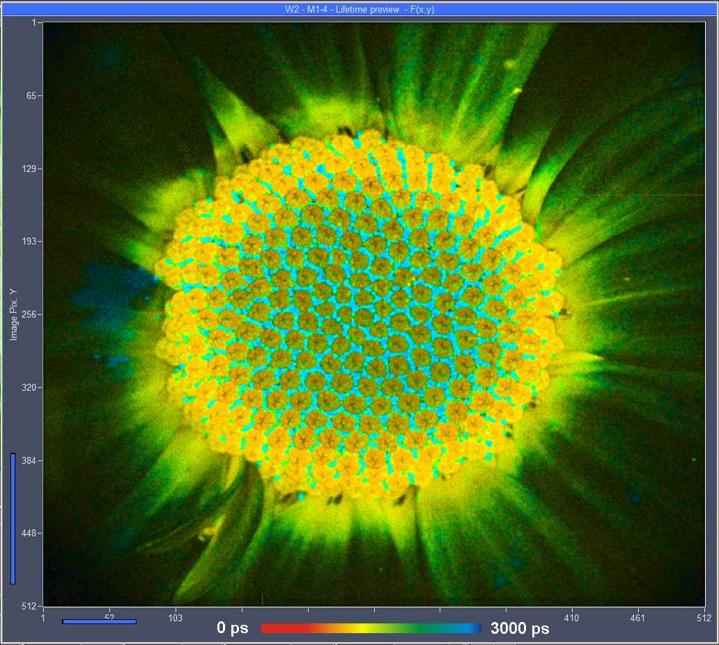 Рисунки: Слева: DCS-120 MACRO с системой FASTAC FLIM. Справа: FLIM-изображение: 512 x 512 пикселей, 1024 временных канала, время получения: 2 секунды. Изображение, созданное с помощью онлайн FLIM -алгоритма программного обеспечения сбора данных SPCM.