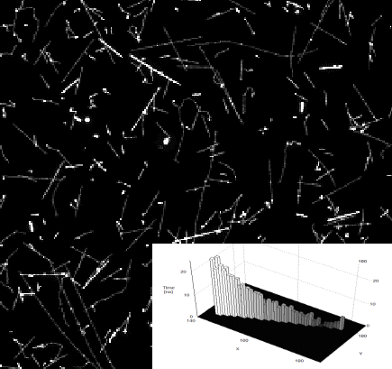 Иллюстрация чувствительности Timepix3 на уровне одиночных частиц. Треки разных частиц (в основном мюонов и нескольких протонов) были зарегистрированы за 5 минут на борту самолета. На вставке показан временной профиль вдоль одного мюонного трека.