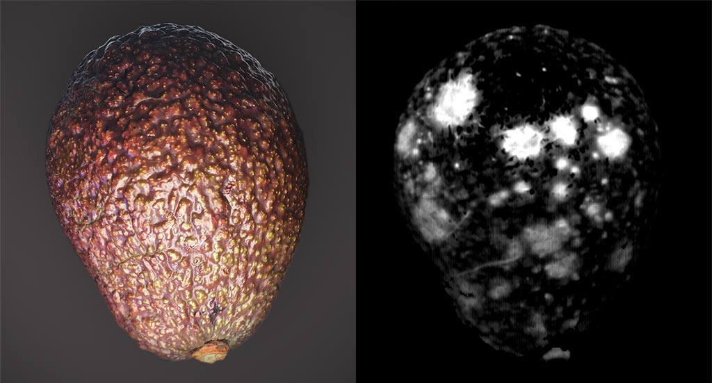 Спектральное изображение показывает пятна под кожицей авокадо.