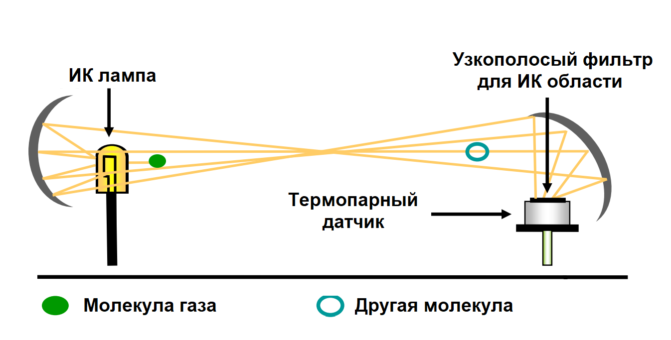 Одно из основных применений - измерение концентрации газа. Концентрация газа может быть измерена путем контроля поглощения инфракрасного луча. Излучающий поток пропорционален выходному напряжению модуля датчика. Специальный источник инфракрасного света используется для генерации теплового излучения. Инфракрасный источник должен быть импульсным, чтобы устранить паразитные температурные воздействия. Температура корпуса модуля датчика может использоваться для компенсации влияния дрейфа температуры окружающей среды. Базовое уравнение для измерения концентрации газа в инфракрасном диапазоне - это закон Бера: