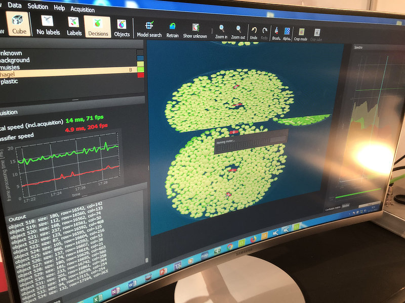 Демонстрация обнаружения посторонних пластиковых объектов в режиме реального времени с помощью гиперспектральной камеры Specim FX17 (900 – 1700 нм) и софта perClass Mira.