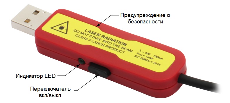 Разъем USB Type-A на каждом лазерном модуле оснащен встроенным электрическим фильтром с высокой степенью ослабления, что позволяет снизить уровень шума и повысить стабильность лазерного излучения. На разъеме также имеется светодиодный индикатор состояния, выключатель питания и информация с предупреждениями по безопасности. В отличие от лазерных модулей Thorlabs с разъемами Phono-Jack и лазерных модулей с неизолированными проводами, для работы данных лазерных модулей не требуются адаптеры или дополнительные разъемы.