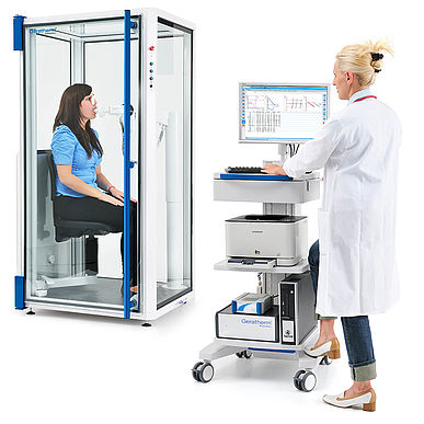 Университет прикладных наук Würzburg-Schweinfurt, а также баварская компания Geratherm Respiratory GmbH занимаются изучением таких биомаркеров. Они разработали прототип системы измерения дыхательных газов для неинвазивной диагностики, которая позволяет обнаруживать заболевания легких, а также метаболические и раковые заболевания. Для исследования необходимо, чтобы пациент дышал в мундштук измерительной системы. Дыхательные газы поступают в сферическую измерительную камеру, позолоченную изнутри. Камеру пронизывает ИК излучение. Пироэлектрические детекторы со специальными фильтрами измеряют пропускание газовой смеси. Результаты измерений служат основой для постановки медицинского диагноза. |