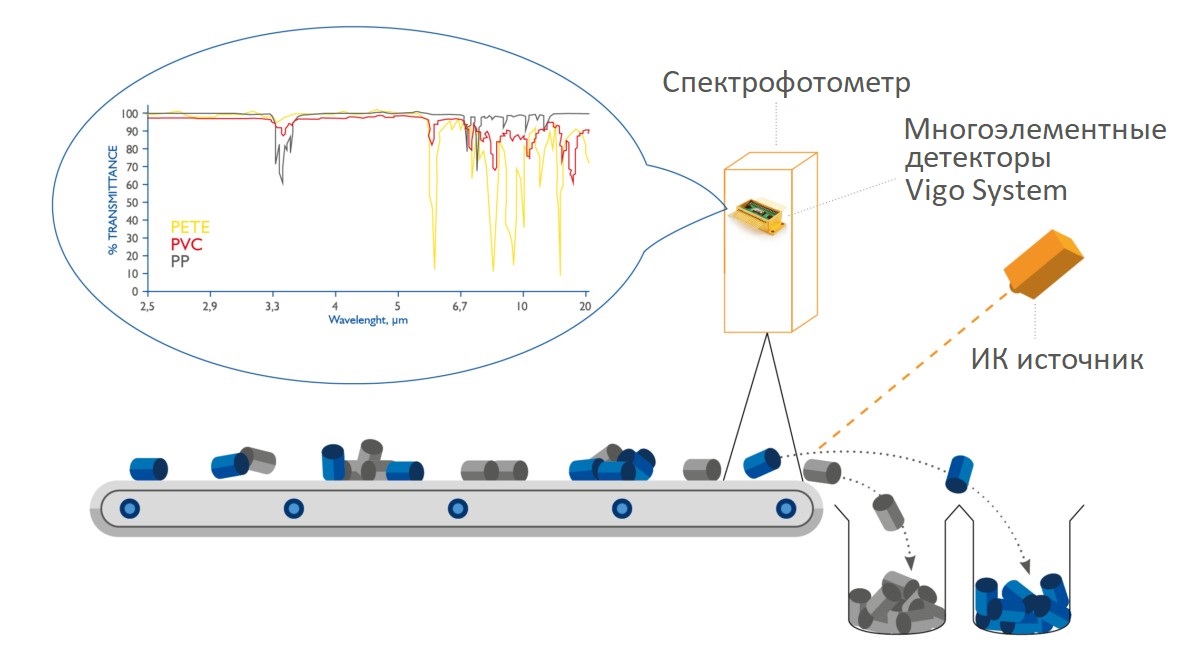 При обнаружении каждой отмеченной полосы поглощения детектор VIGO System может «видеть» тип измеряемого пластика. Использование многоэлементных детекторов в спектрофотометрии позволяет исключить использование движущихся частей или фильтров. Это упрощает спектрофотометр, позволяет сделать его более компактным и повышает надежность системы.