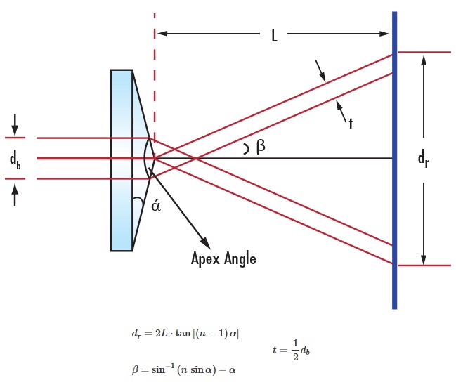 Аксиконы - это конические призмы, которые преобразуют падающий луч в кольцо. Параметры кольца определяются углом альфа и углом при вершине аксикона. По мере увеличения расстояния от аксикона до экрана визуализации диаметр кольца увеличивается, а толщина линии остается постоянной. Учитывая, что входной сигнал является коллимированным лучом, с помощью он-лайн калькулятора Edmund Optics Вы можете рассчитать диаметр внешнего кольца и толщину линии, создаваемую аксиконом. Расчет половины угла веерного пучка будет приблизительным. Калькулятор делает расчеты, исходя из известных переменных и используя уравнения для определения неизвестных. На рисунке выше показано прохождение коллимированного пучка через аксикон.