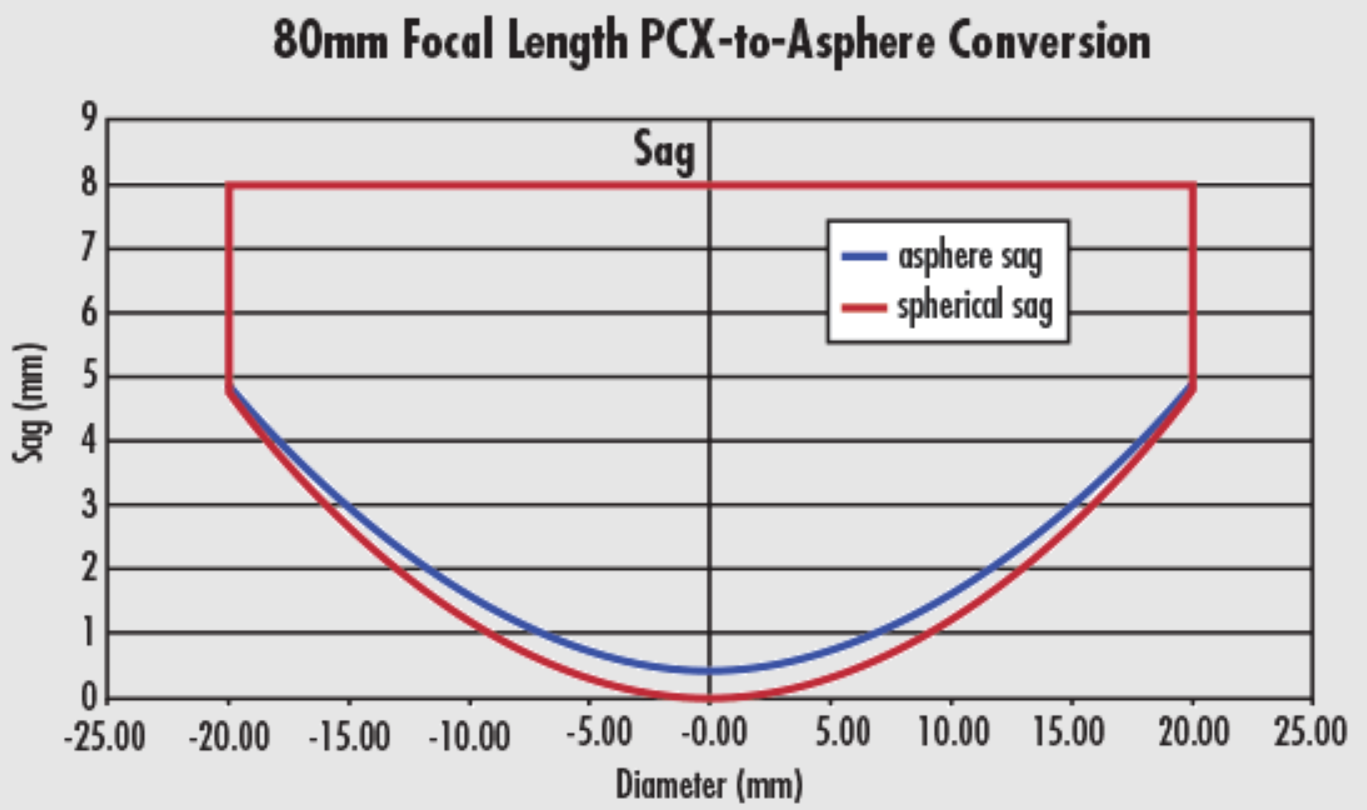 Пример: если приложению требуется линза диаметром 40 мм, фокусным расстоянием 80 мм, работающая на длине волны 852.1 нм, компания может быстро изменить стандартную линзу PCX в соответствии с этими требованиями. Введя отрицательную коническую постоянную и удалив около 400 микрон материала, получится асферическая линза, которая значительно превосходит исходную линзу PCX.