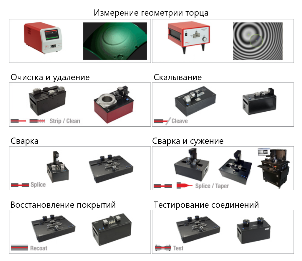 Оборудование Vytran® от Thorlabs предназначено для сварки, обработки оптических волокон и контроля геометрии их торцевых поверхностей. Для создания соединений волокон с высокой механической прочностью и хорошими оптическими характеристиками эти инструменты выполняют ряд задач, включая зачистку, скалывание, сращивание, повторное покрытие и контрольные испытания. Системы Vytran® серии GPX могут сваривать волокна или торцевые насадки и формировать волокна в конусы, шаровые линзы, соединители / комбайнеры или другие виды нестандартных заделок. Сканирующие интерферометры Thorlabs (SWLI) позволяют проводить подробные измерения геометрии торца разъема для контроля качества.