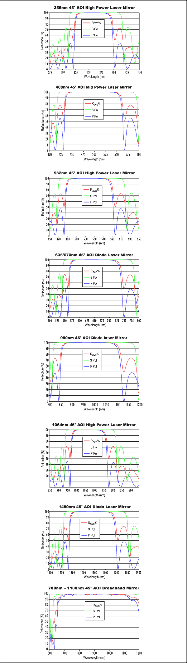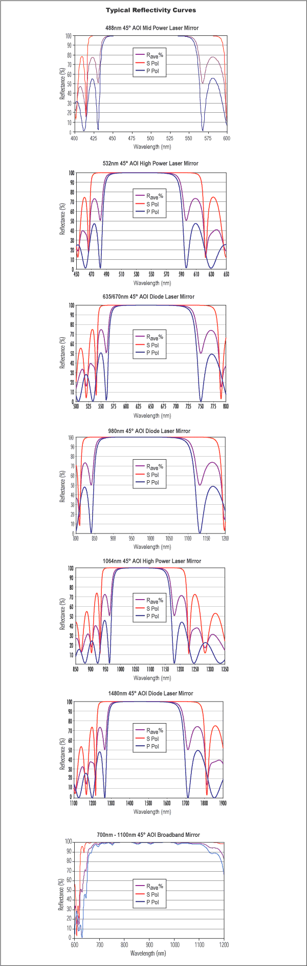 Зеркала TECHSPEC® для работы с диодными лазерами предназначены для обеспечения высокого отражения для наиболее распространенных длин волн диодных лазеров. Эти зеркала, рассчитанные на угол падения 0° или 45°, идеально подходят для управления лучом и складывания.