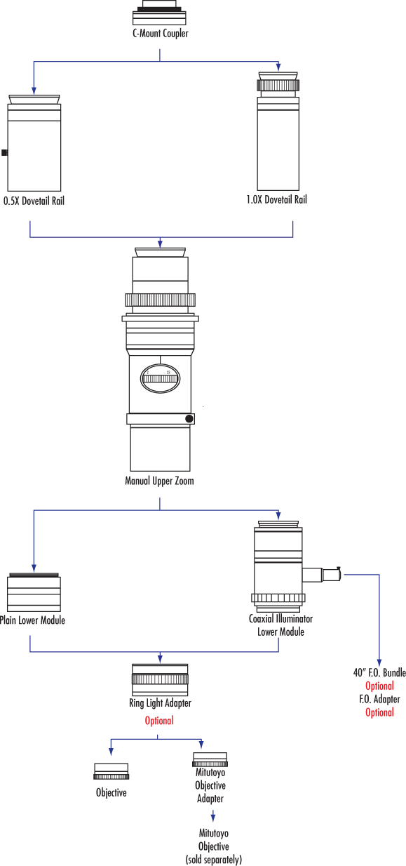 Для полной оптической системы требуются следующие компоненты: муфта C-Mount, трубка типа «ласточкин хвост», верхний модуль масштабирования, нижний модуль и объектив (доступен адаптер Mitutoyo). Моторизованный верхний zoom-модуль включает в себя контроллер и необходимые кабели. И ручной верхний zoom-модуль, и моторизованный верхний zoom-модуль имеют ручную диафрагму. 40-дюймовый гибкий волоконно-оптический пучок разработан специально для адаптации к нижнему модулю коаксиального освещения. Волоконно-оптический адаптер позволяет использовать оптоволоконный пучок с нашими оптоволоконными осветителями (за исключением Mille Luce). Дополнительный адаптер кольцевого освещения (# 56-215) позволяет установить кольцевой световод (#54-173) на объектив.