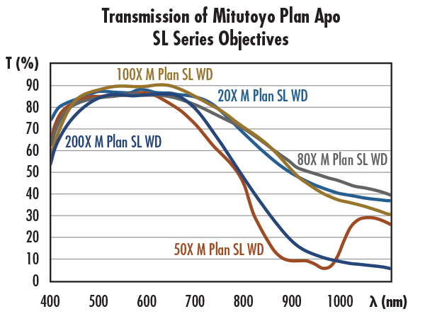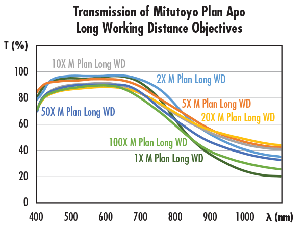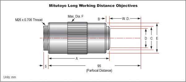 Объективы Mitutoyo всемирно известны тем, что задают стандарты качества для оптики микроскопов с большим рабочим расстоянием. Они достигли наилучшего сочетания рабочего расстояния и оптических характеристик за счет использования нового подхода, избегая устаревших решений, используемых конкурентами. Увеличение размеров и длин объективов упростило конструкцию (парфокальное расстояние 95 мм). Все объективы – апохроматы, чтобы поддерживать как можно более высокую числовую чувствительность и контраст. Апохроматическая линза объектива имеет хроматическую аберрация, скорректированную для красного, синего и желтого цветов, в то время как стандартная ахроматическая линза объектива корректируется только для красного и синего. Апохроматы, как правило, очень дороги, но производство в больших объемах позволило снизить стоимость до уровня стандартных ахроматических объективов с большим рабочим расстоянием. Оптимизированные для освещения в светлом поле (падающее освещение параллельно оптической оси), эти объективы идеально подходят для освещения в линию. Для системы коррекции на бесконечность требуется вторичная (или тубусная) линза. Все указанные увеличения основаны на фокусном расстоянии тубуса 200 мм. Монтажная резьба: M26 x 0.706 (36 TPI).